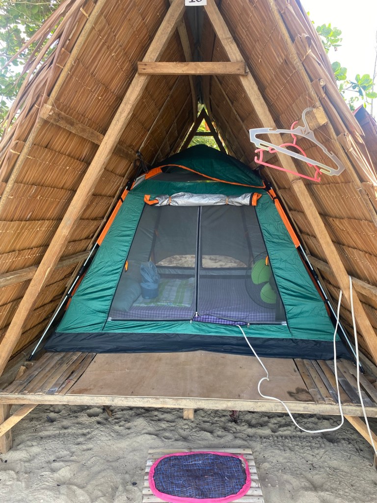 We checked into our luxurious £5-a-night —yes, you heard that right, just a fiver! For those feeling fancy, you could splurge a tad more for a hut on the beach, but spoiler alert: it comes without a sea view! So, you might as well admire the stunning wall in your luxurious tent instead!