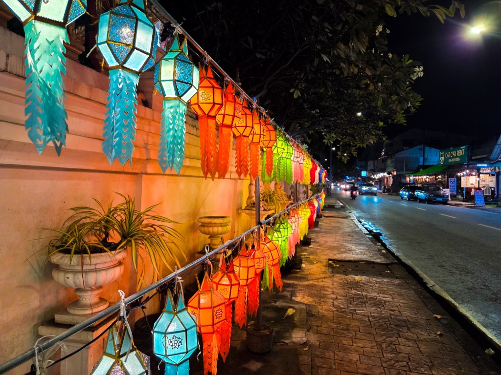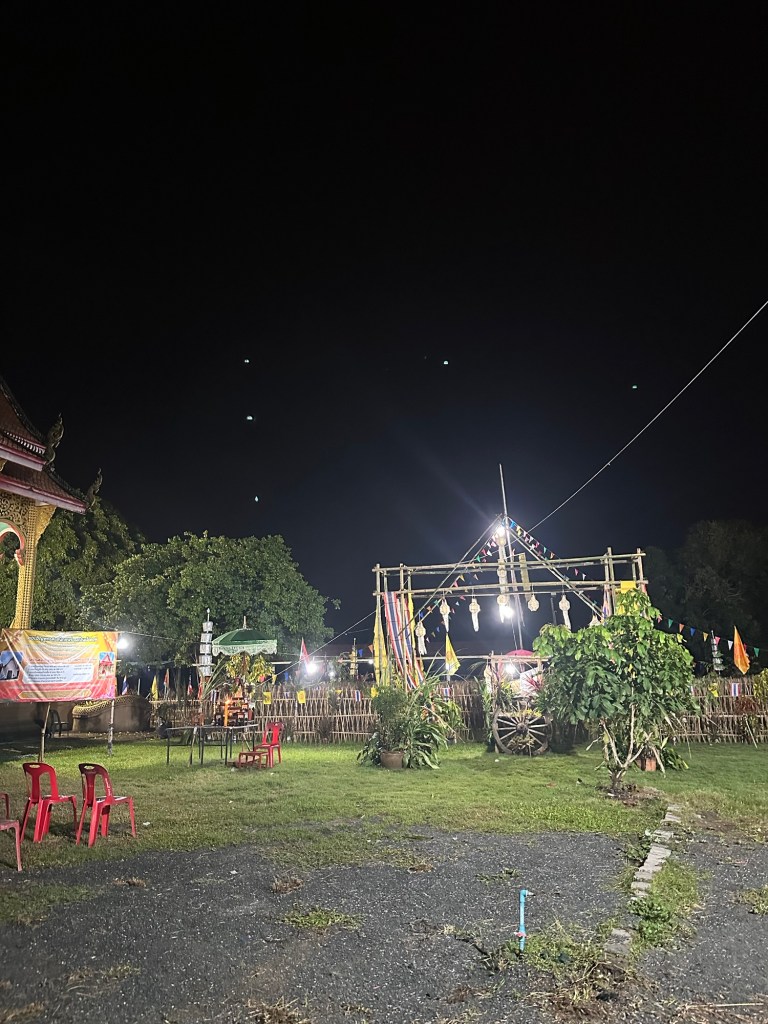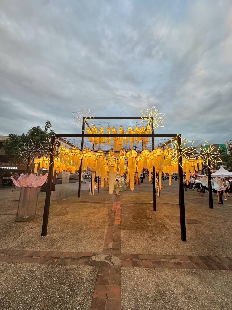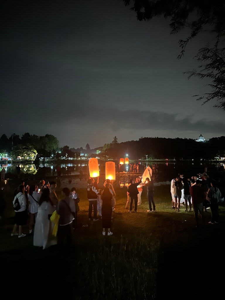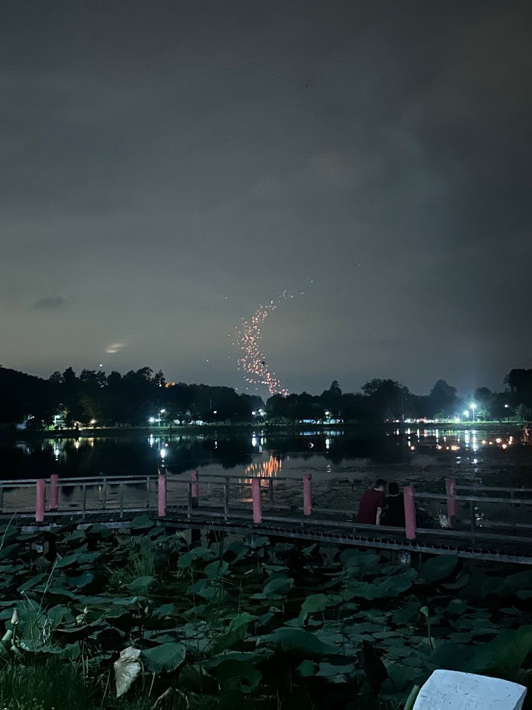 Day 3 of the festivities also brought many steps. We spent the morning relaxing at the pool and then in late afternoon, we set off walking to Doisaket lake to take part in a free lantern release. We were optimistic after speaking to many locals, but research online informed us that this year (2025) and next year (2026) it would be cancelled due to construction. When we arrived, there were a few stalls set up selling Krathongs and food, but you could see that it was indeed under construction and needed some TLC. We sat, and we waited. It was worth the wait. If you’re going and expect to be surrounded like you see online, then you will be disappointed. What we saw was a steady stream of lanterns being released by the lake, as well as the mass organised release in the distance. There were fireworks going in all different directions, and generous locals who gave us not one but two lanterns as we had come empty handed. As we later walked around the lake, there were now people selling them but keep in mind you may not want to turn up empty handed just in case.