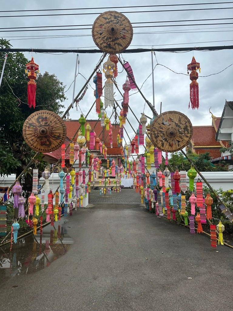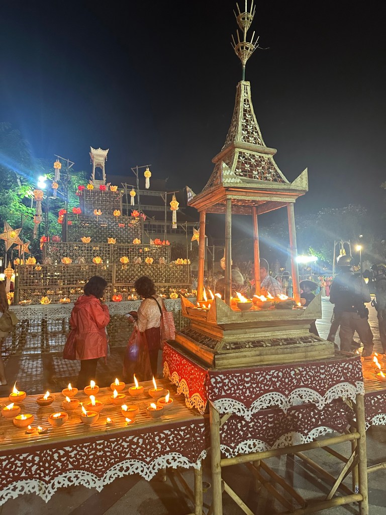 With that, we set off into Chiang Mai town which was decorated with lanterns, and in the evening lights. There were parades and even a night cultural walk and free prizes for scanning QR codes around the Old Town, (can’t say no to free souvenirs). We were running all over the city, stopping at numerous temples and points of interest. Sweaty work, but worth it. We finished the night making our own Krathongs (there are a lot of places to do this in town, we just stumbled across a hostel that were offering this). We floated our Krathongs on the Ping river and then jumped in a Grab back to our hotel.
